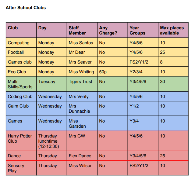 Please find attached the timetable of the after school clubs this term.