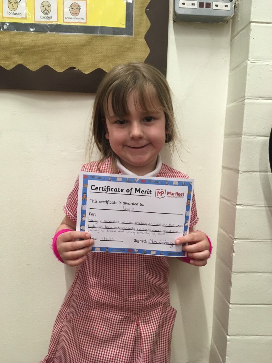 | 1 | Layla for being a superstar in her reading and writing this week. Layla has been independently writing sentences about the journey of bread and has been using some amazing adjectives! |